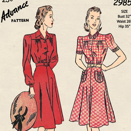 1940s Shirt Waist Dress Sewing Pattern Pdf Print At Home Etsy